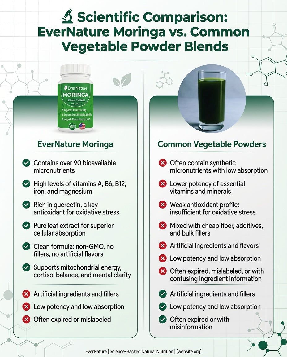 EverNature Moringa is gentle, easy to digest, and can be taken daily. It contains no caffeine, stimulants, or synthetic ingredients.